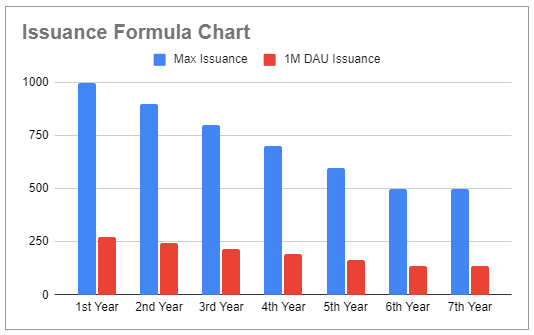 <figure><img src="https://2939928069-files.gitbook.io/~/files/v0/b/gitbook-x-prod.appspot.com/o/spaces%2FNrUGucD54SHwTTq9FuPP%2Fuploads%2F6YHidizVOzLTta3wua5e%2Fimage.png?alt=media&#x26;token=9e41e807-355d-468c-aff4-352153122781" alt=""><figcaption><p>정식서비스 개시 1년차 ~ 7년차까지 MRST 최대 발행량(파란색) 및 100만 DAU일때 발행량(빨간색)</p></figcaption></figure>