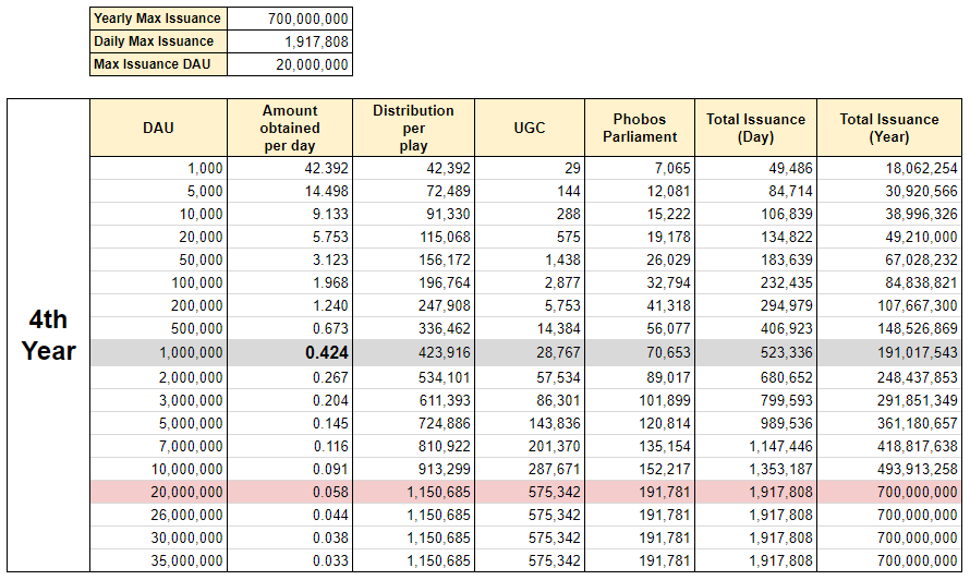 일별 활동 사용자 수인 DAU(Daily Active User)가 예상치보다 적을 경우 Mars Token의 하루 최대 획득량은 60개로 제한하며, 2000만명의 DAU일때 그해의 최대발행량에 해당하는 MRST가 매일 분배됩니다. DAU가 줄어든다면 1인당 받는 MRST의 수는 늘어나지만 전체 발행량은 줄어듭니다.