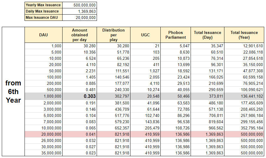 Official Service from 1st year to 7th year of max. MRST issuance (in blue) and 1 million DAU (in red)